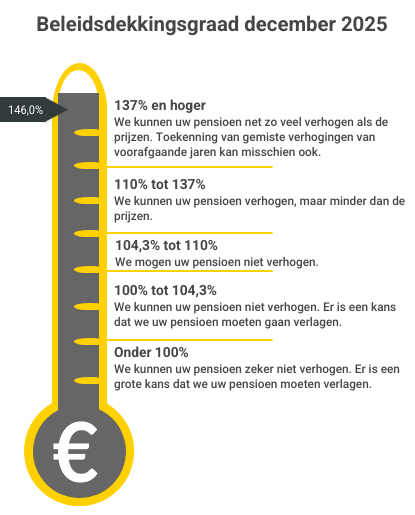 Onze actuele dekkingsgraad is in december gedaald naar 152,4%. Onze beleidsdekkingsgraad steeg met 1,3%-punt naar 146,0%.