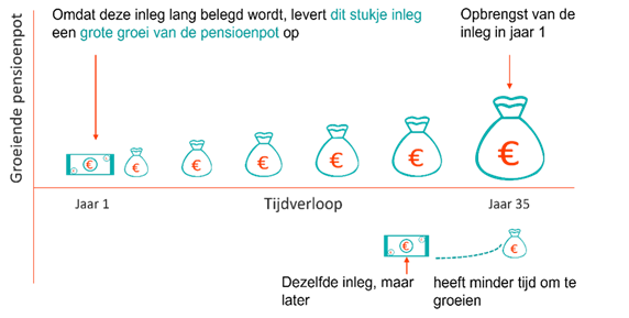 In dit plaatje ziet u waarom dezelfde inleg voor een jongere uiteindelijk méér pensioen oplevert dan deze inleg voor een oudere collega: